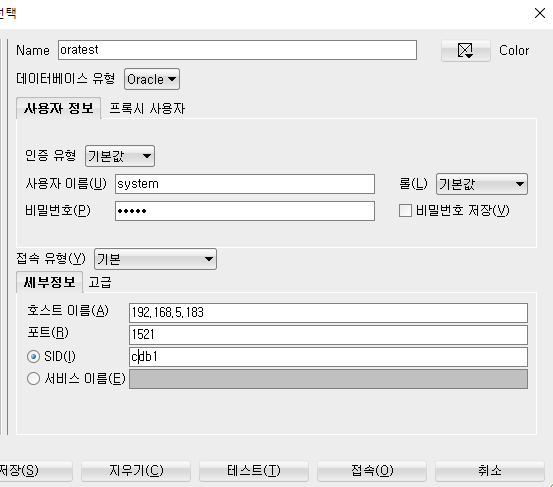 (DESCRIPTION = (ADDRESS = (PROTOCOL = TCP)(HOST = 192.168.10.33)(PORT = 1521)) (CONNECT_DATA = (SERVER = DEDICATED) (SERVICE_NAME = PDB1)))에 접속하려고 시도하는 중